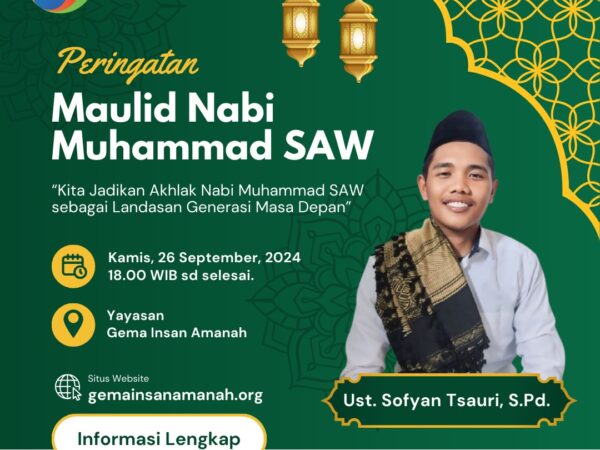 Assalamualaikum warahmatullahi wabarokatuh Dalam rangka memperingati hari lahir Nabi Muhammad SAW. Yayasan Gema Insan Amanah akan mengadakan peringatan Maulid Nabi..